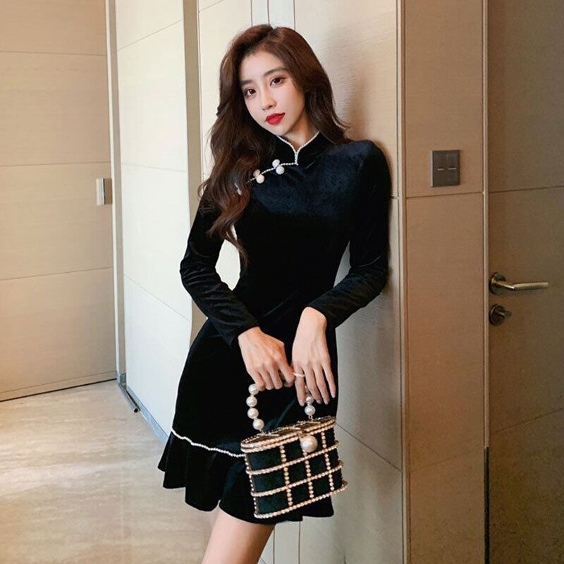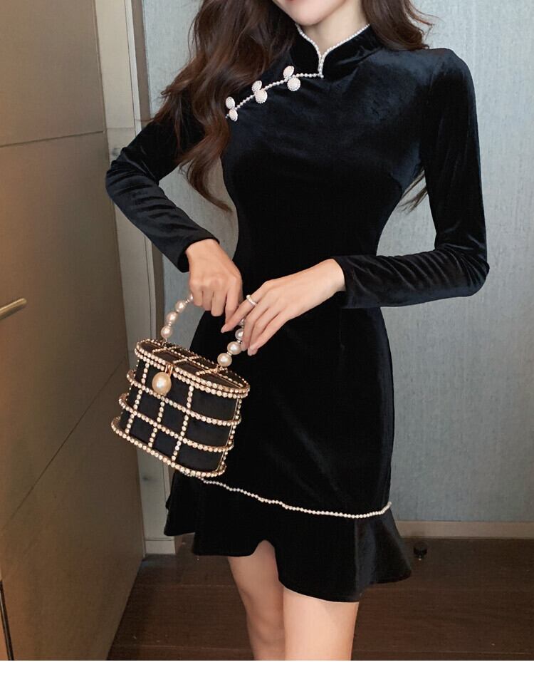 2021年秋新しい女性の若いレトロな気質ビーズゴールドベルベットフィッシュテール改良チャイナドレス micat54984463649
