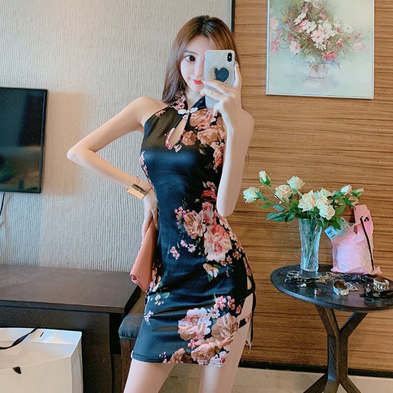ネット赤いアンカー服女性らしさレトロな中国風セクシーな中空ショートストラップレスハンギングネックチャイナドレス micat93745035906