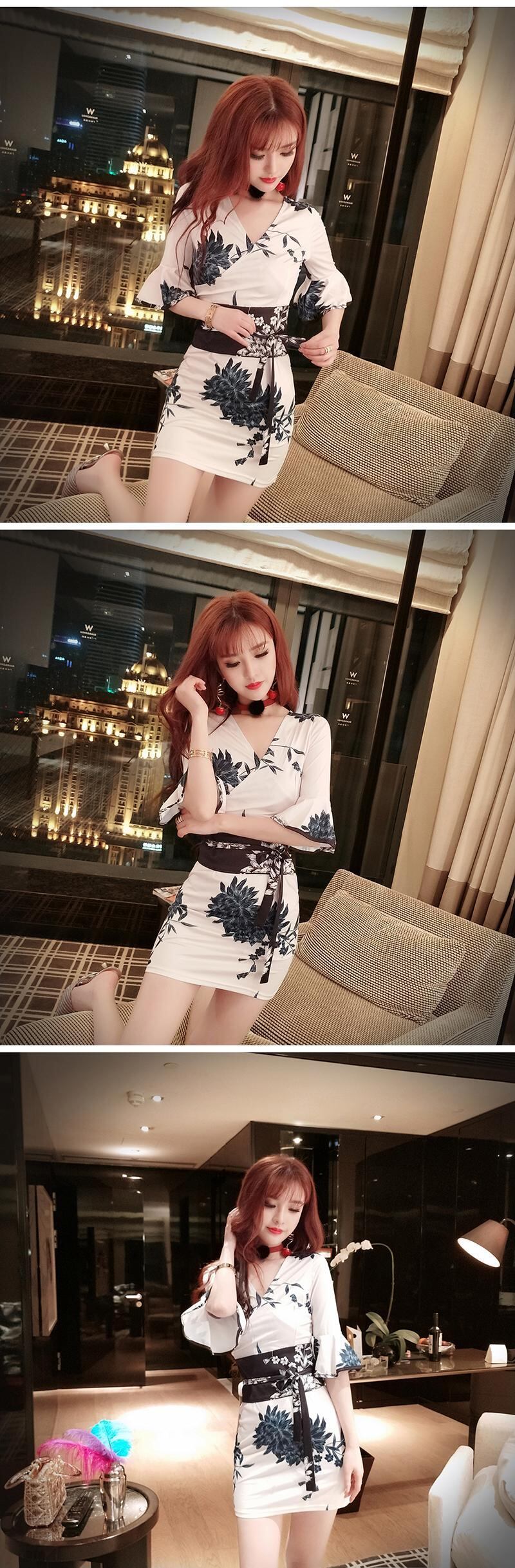 ナイトクラブバーナイトワークウェアセクシークロスVネックフレアスリーブレトロプリントeseドレス micat32016399928