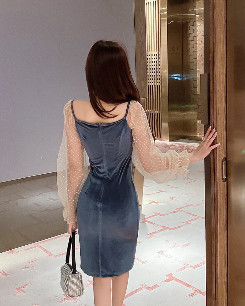 2021年秋新しい女性のスーパーフェアリーネットガーゼランタンスリーブステッチゴールドベルベットフレンチ改良チャイナドレス micat57894947422