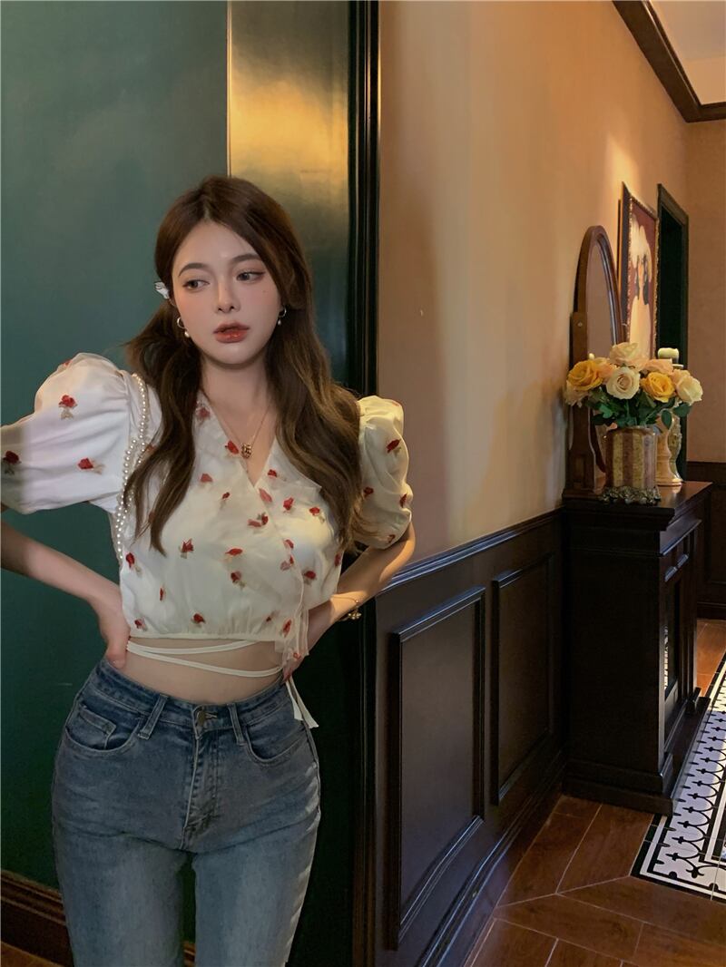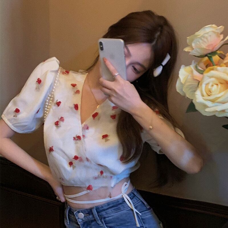 甘くてスパイシーなブラウス女性の夏のデザインセンスニッチスーパーフェアリーメッシュ刺繡セクシーなショートへそシャツ micat18394568841