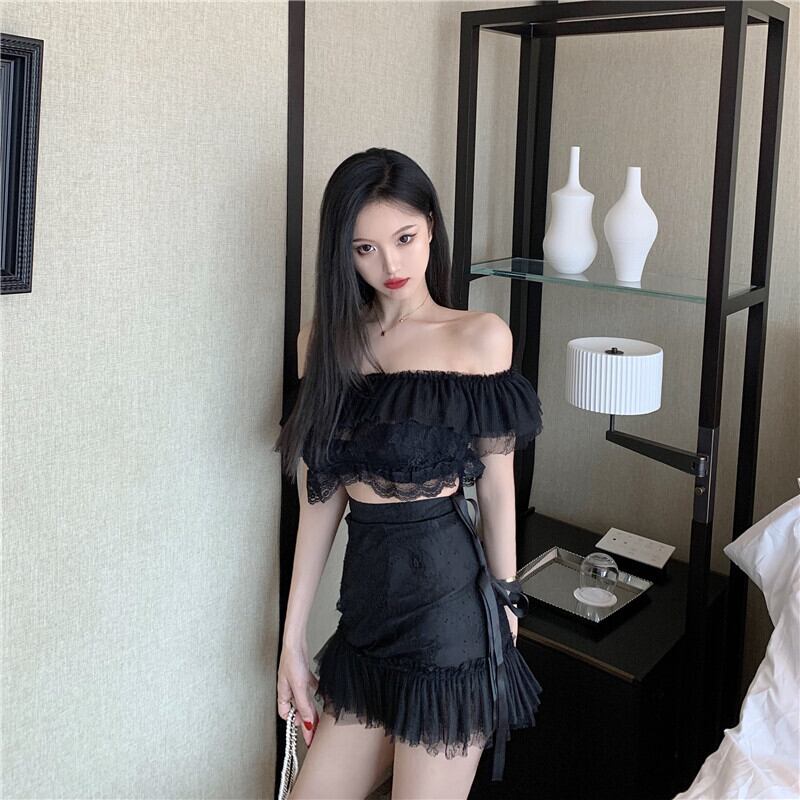 ナイトクラブレディーススーツセクシーなワンネックショートストラップレスレースブラウス+ハイウエストハーフレングススカートツーピーススーツ micat40647637641
