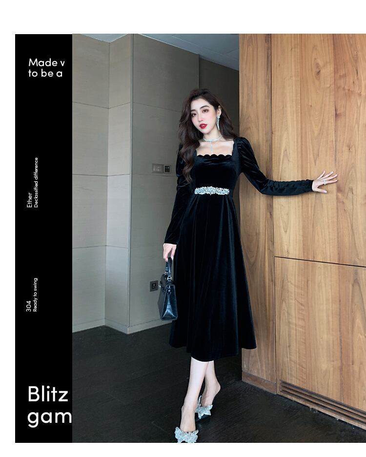 GaoLengfan成熟したロイヤルシスター女性の秋フランスのレトロなヘップバーンスクエアカラーブラックミドルレングスゴールドベルベットドレス micat39229251359