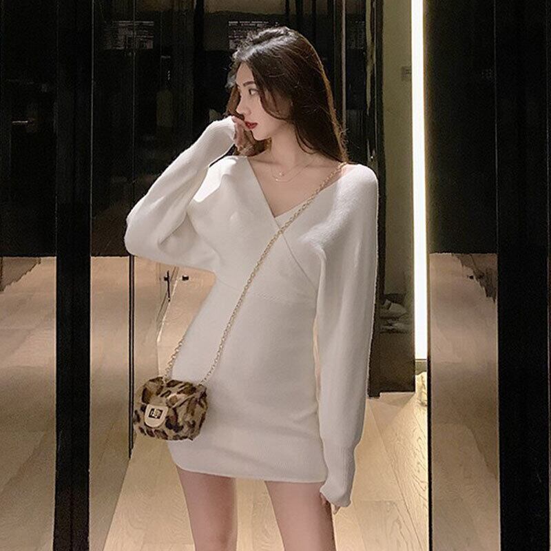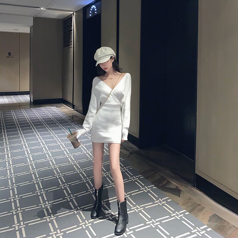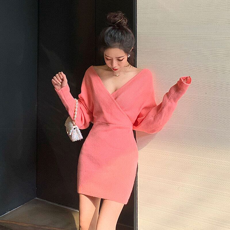 セータースカート秋の服2021新しい女性のセクシーなクロスVネックオープンバックスリムスリミングニットドレス micat27058974248