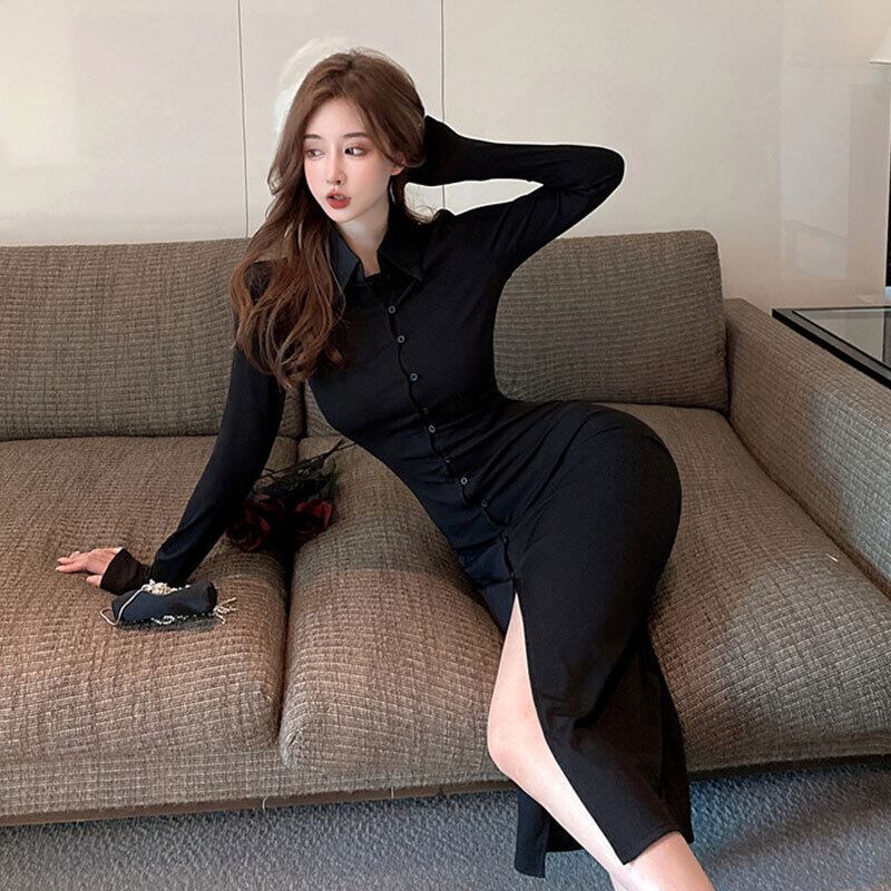 2021年秋新しいスタイルの西洋気質の女神ファンセクシーなミドル丈スプリットスリムスリミングシャツの襟のドレス micat8869064340