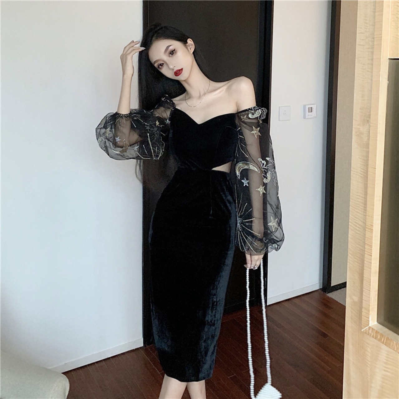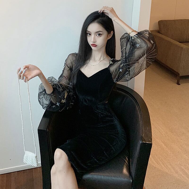 フレンチイブニングドレス女性の宴会気質スーパーフェアリーセクシーメッシュステッチランタンスリーブミドル丈タイトフリースドレス micat66720214662