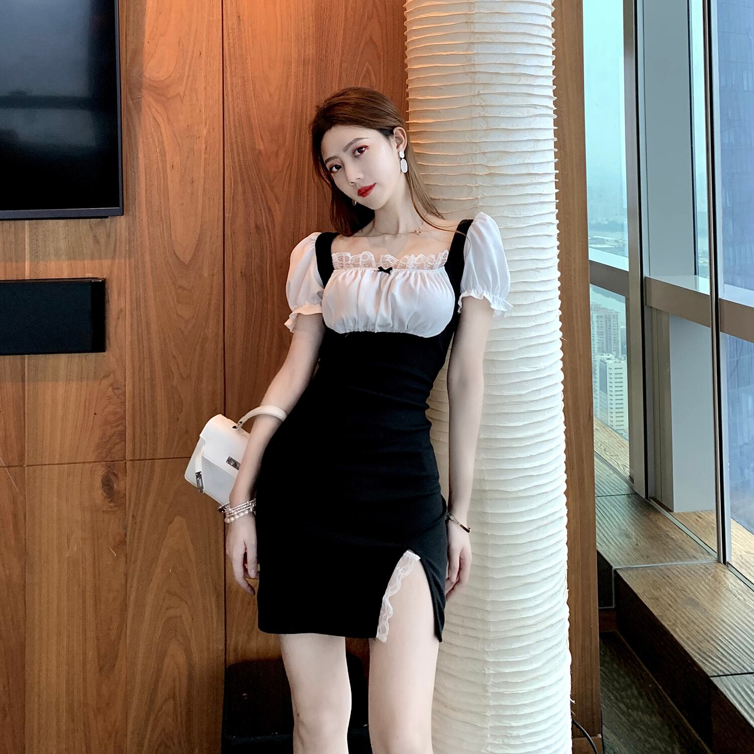 ライブアンカーコスチューム女性フレンチスクエアカラースーパーフェアリーメイドスタイルスウィートセクシーバッグヒップスプリットフェイクツーピースドレス micat59363679778