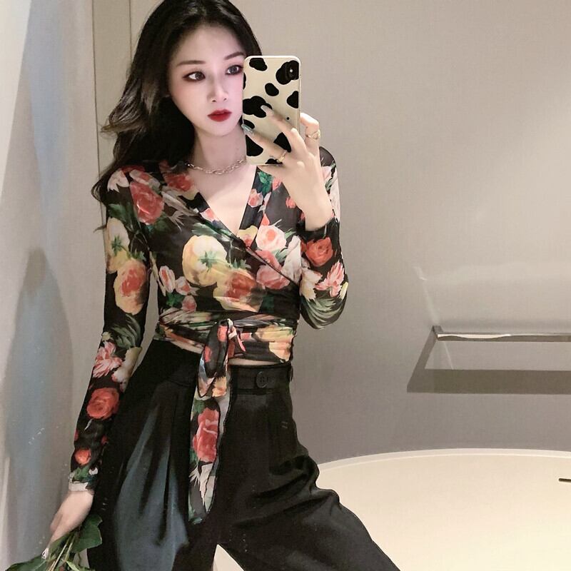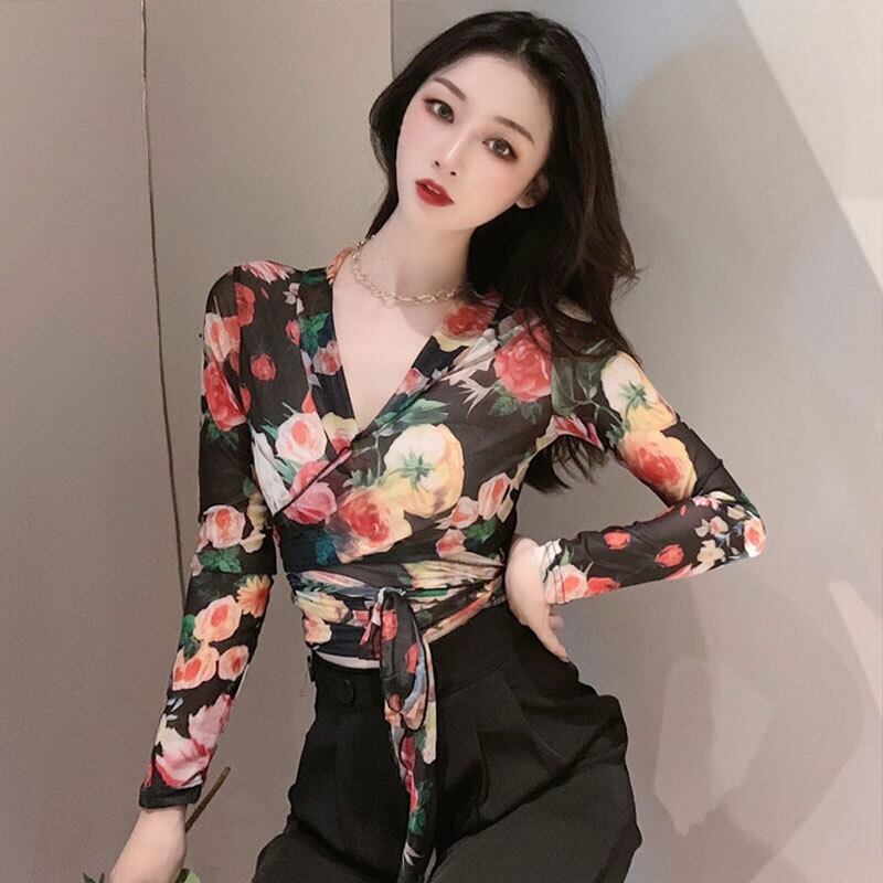初秋の服2021ニューレディーレディース気質レトロプリントセクシークロスVネック長袖メッシュトップス micat91249911764