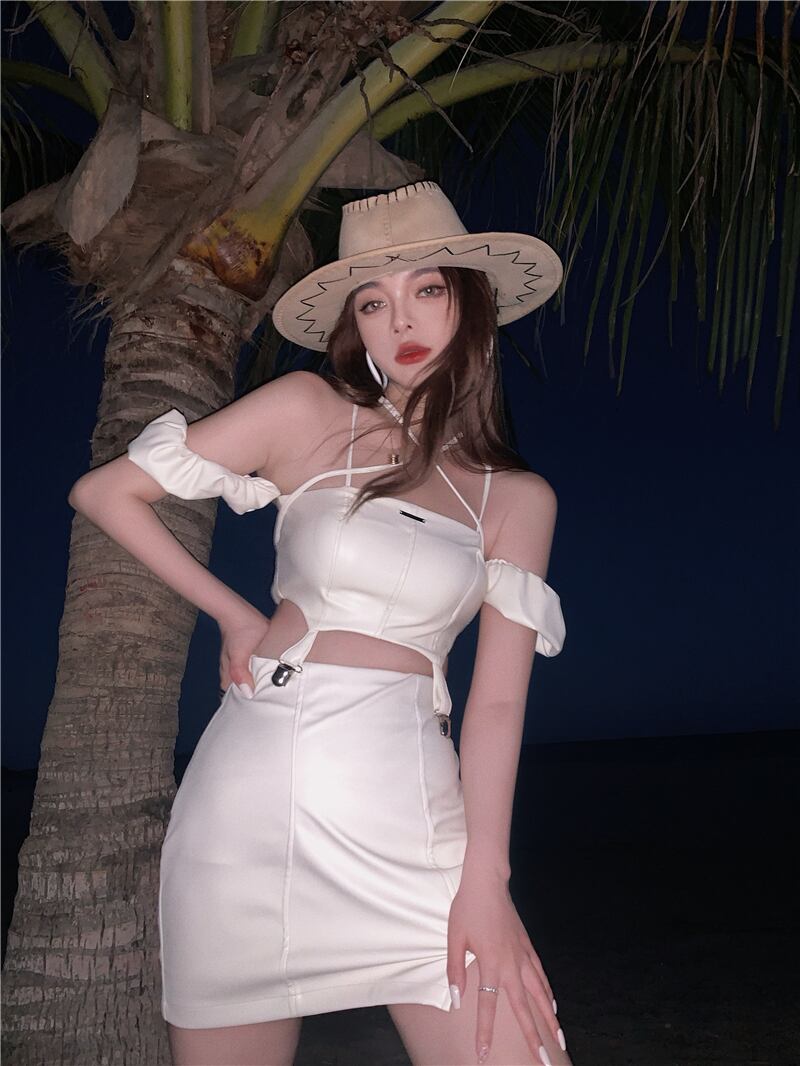 ソルトフライドストリートスーツサマーホットガールセクシーPUレザーショートスリングトップ+ウエストショートスカートツーピースセット micat74694381411