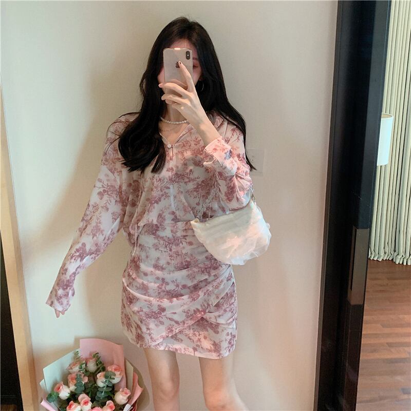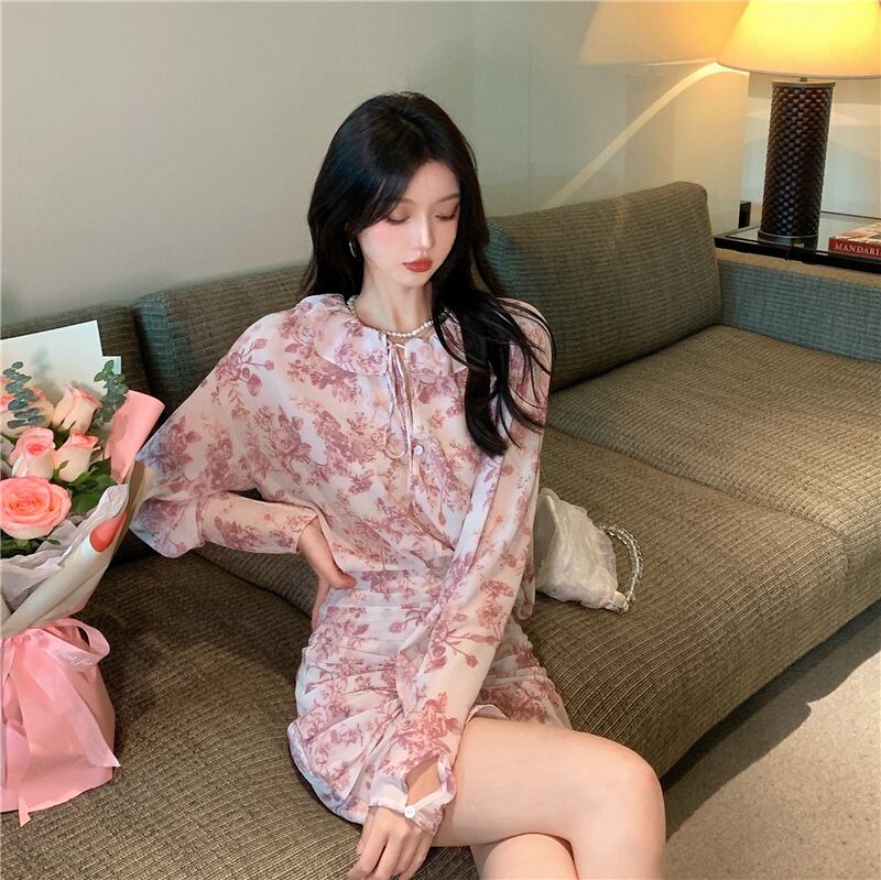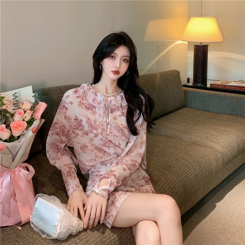 初秋のスーツ女性スーパーフェアリーフレンチシフォンシャツレトロフローラル長袖シャツ+ハイウエストショートスカートツーピーススーツ micat15684915425