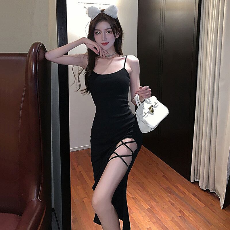 リトルブラックドレス女性サマードレス2021新しい女性気質セクシーなハイスリットクロスストラップミドル丈サスペンダードレス micat85866521178