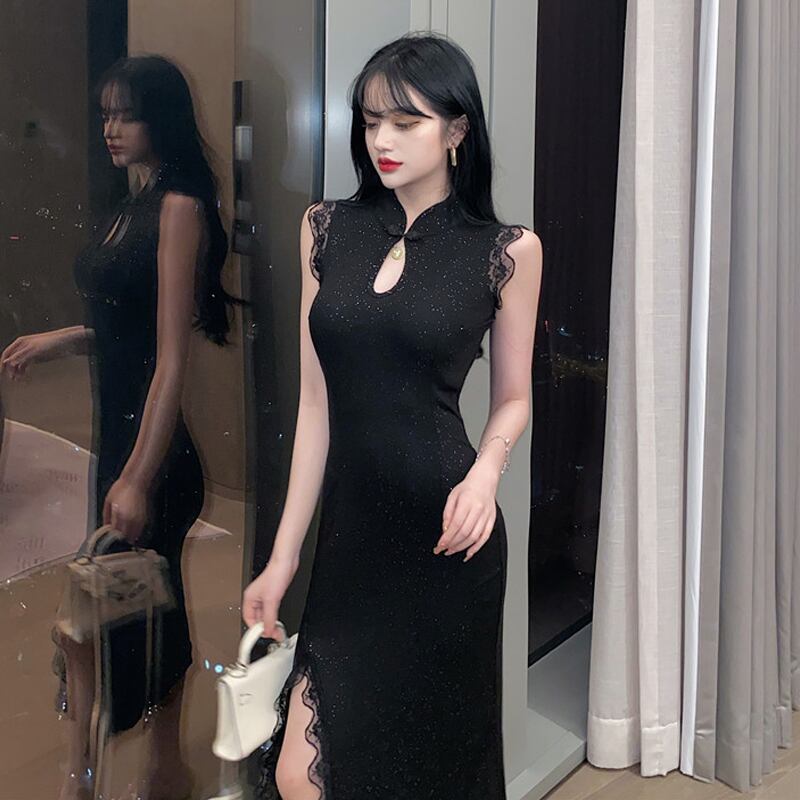 チャイナドレスイブニングドレス2021新しいスタイルの若い中国風ノースリーブブラックセクシーミドル丈ドレス micat63341947499