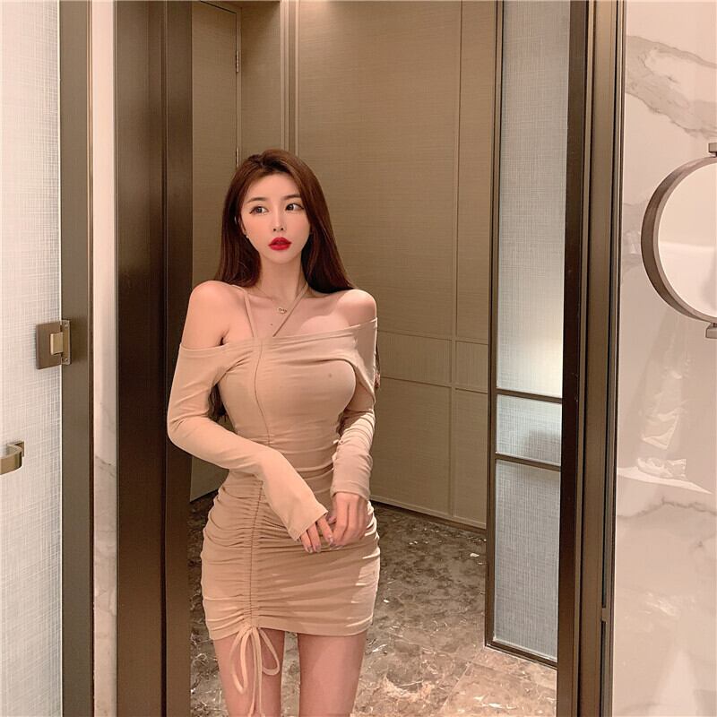 2021年秋新しい女性の超セクシーな斜めの襟長袖タイトフィット巾着ヒップストラップレスホルターネックドレス micat73292087218