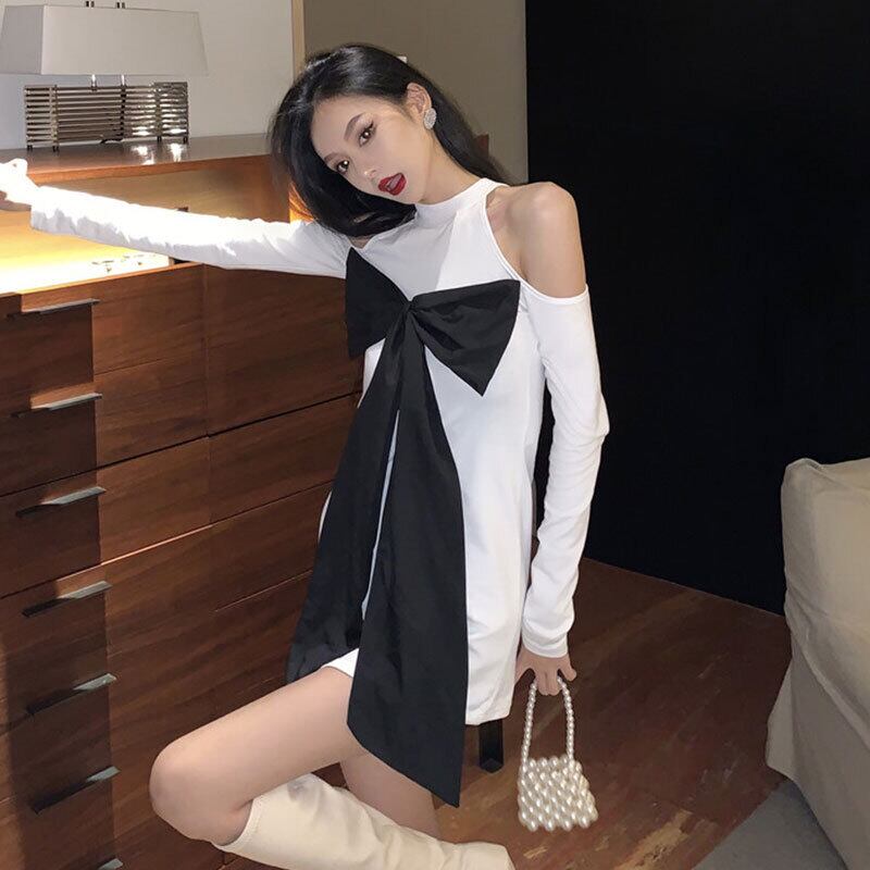 2021年秋新しい女性のネット赤いアンカー甘い大きな弓セクシーな長袖ストラップレスホルタードレス micat54100766060