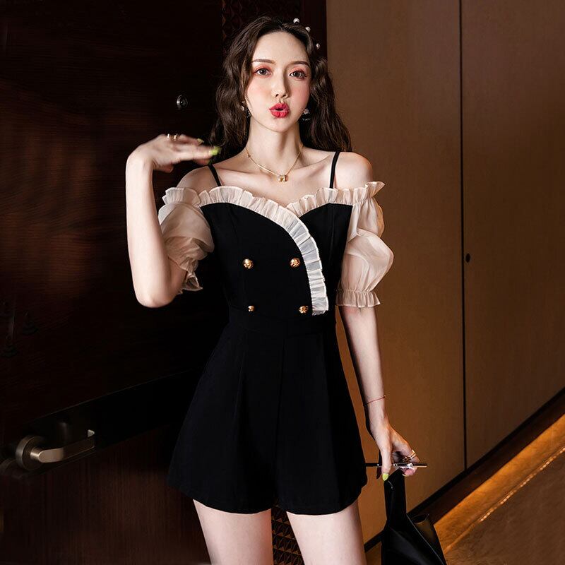 スリングジャンプスーツ女性の夏の気質フレンチパフスリーブセクシーなワンラインカラーストラップレスウエスト細いショーツ micat13065619428