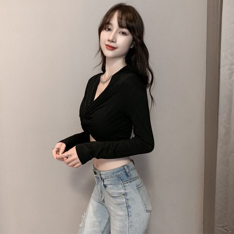 初秋のトップデザインセンスニッチライブ放送アンカー服セクシーローカットディープVネックハイウエストショートおへそTシャツ micat73924875062