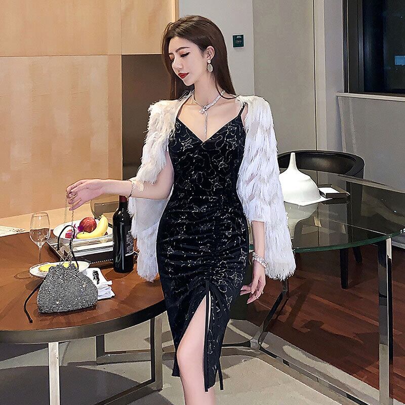 ナイトクラブの女性のナイトドレスセクシーなローカットの深いVネックの光沢のあるゴールドのベルベットのサスペンダードレス micat62369823295