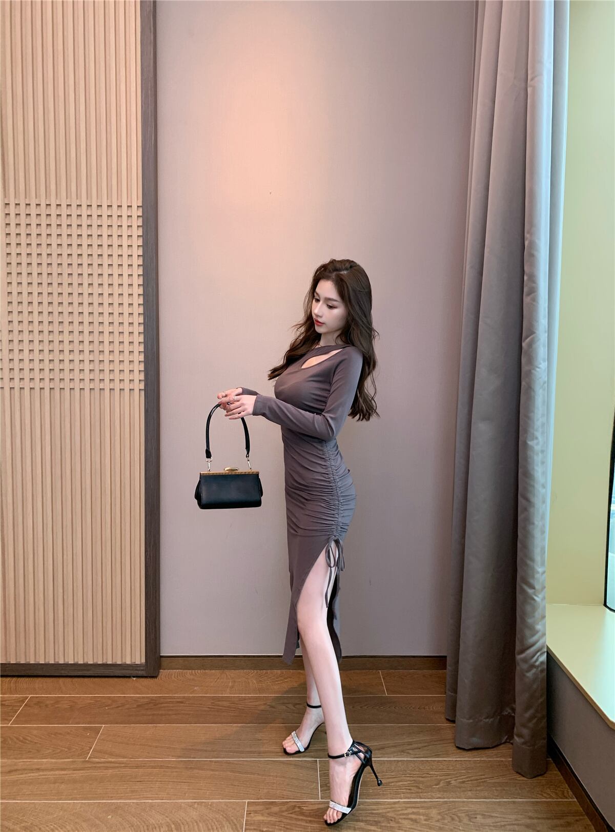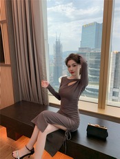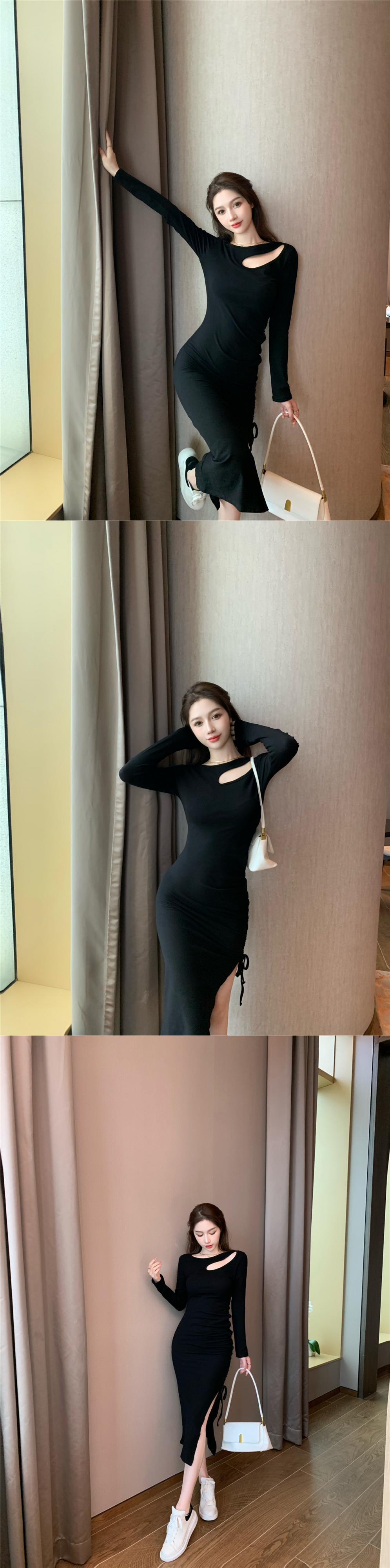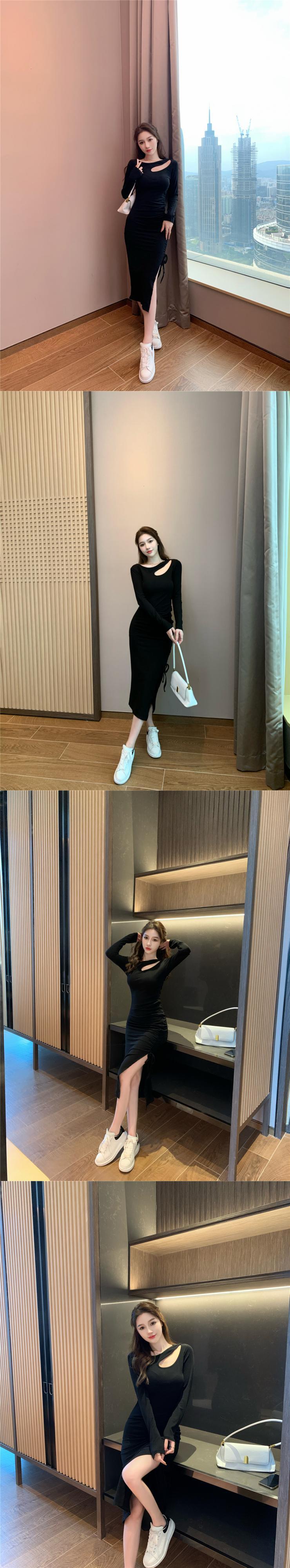 秋のニュースタイル女性シックなデザインセンスニッチ気質セクシー中空スリットミドル丈インナーベースドレス micat80411964325