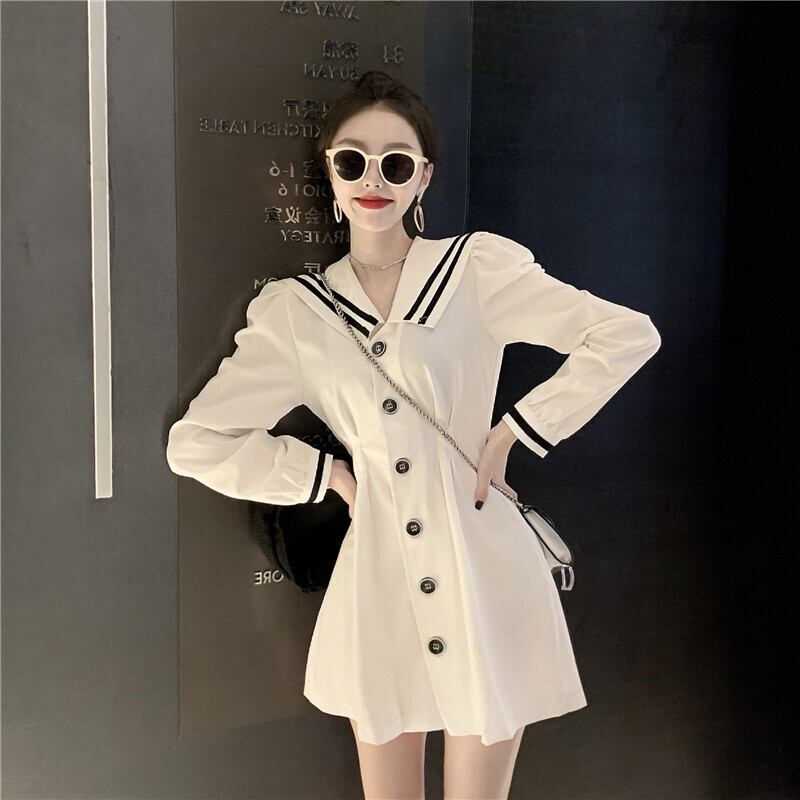2021年秋新しいスタイルの女性の気質年齢を減らす大学スタイルのネイビーカラーシングルブレスト長袖ヒップドレス micat65173561087