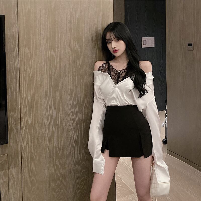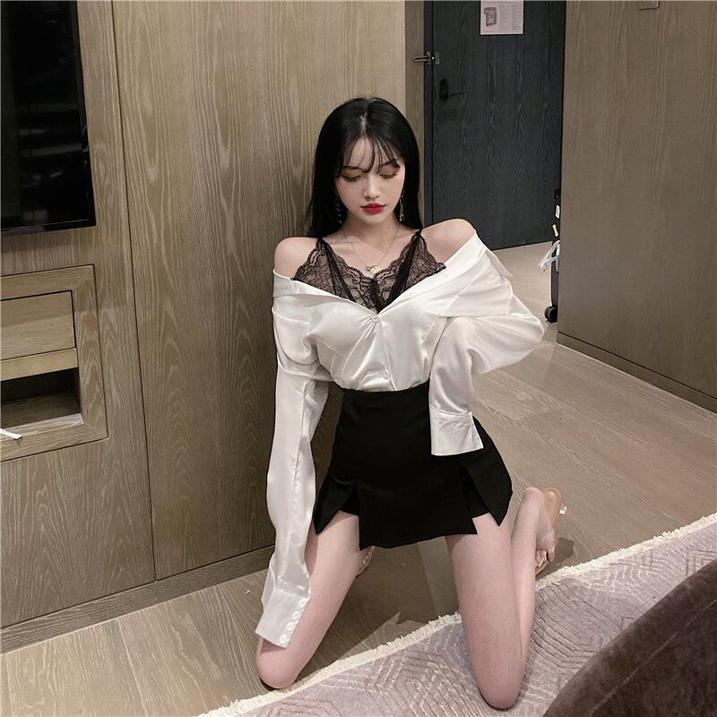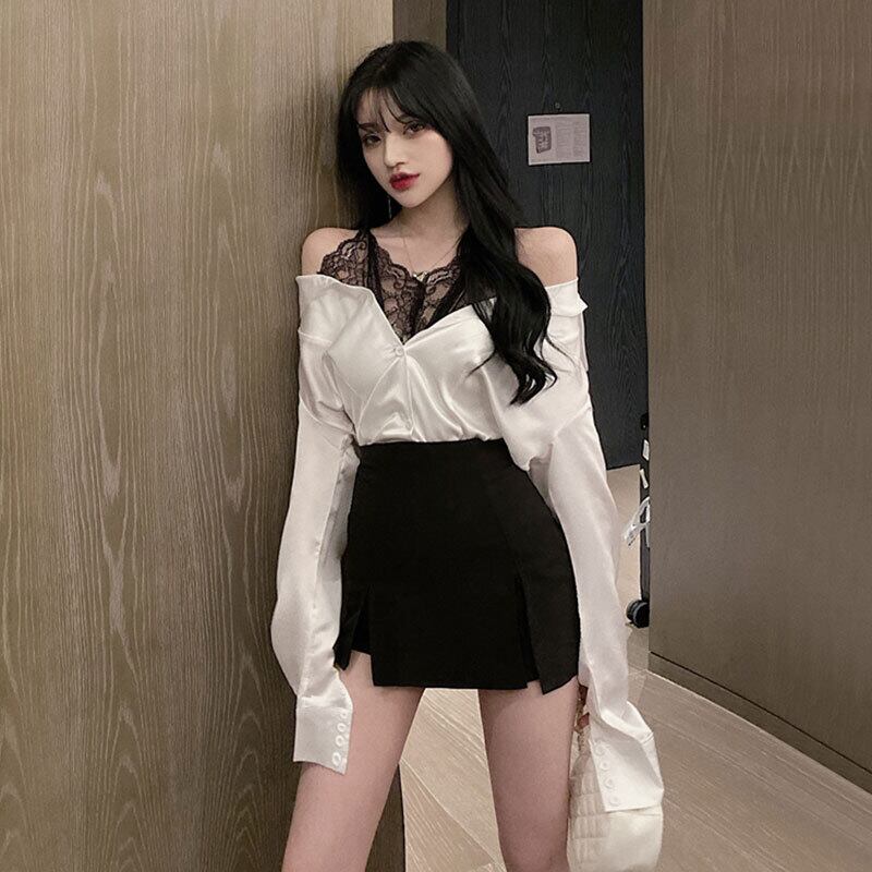 2021年秋新しい女性のネットの赤いアンカー気質セクシーなレースのステッチ偽の2つの長袖オフショルダードレス micat21756338517