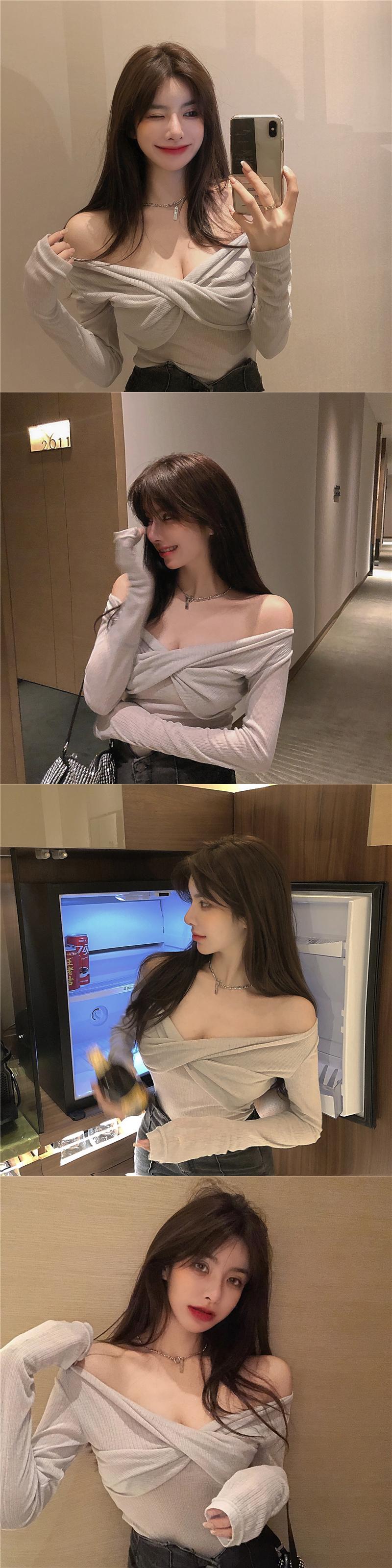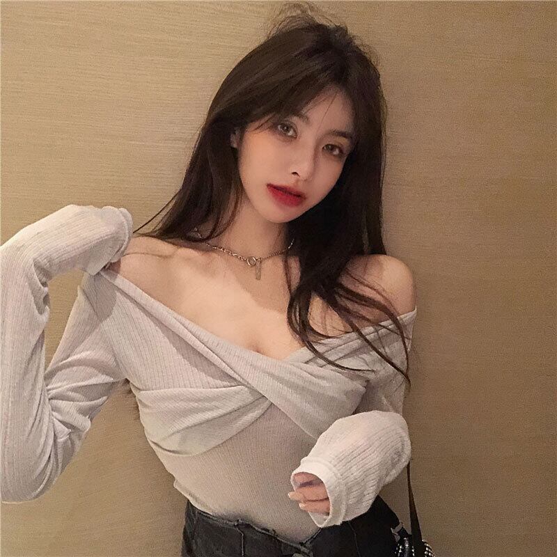 ニッチシックなトップス2021年新作レディース初秋のセクシークロスVネックワンショルダーオフショルダーセーターTシャツ micat28731054853
