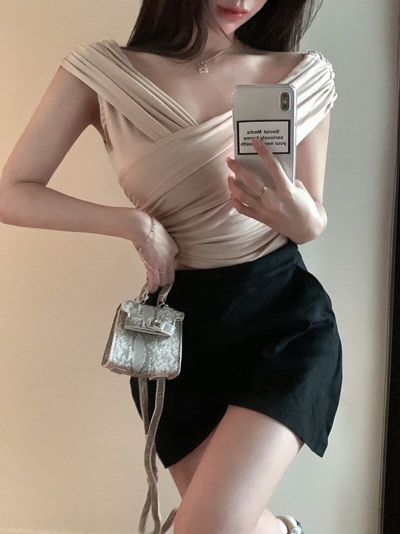 気質女神ファン服ネットセレブアンカータイドピュアカラーフォールドセクシークロスVネックスリムスリミングシャツ micat11322919825