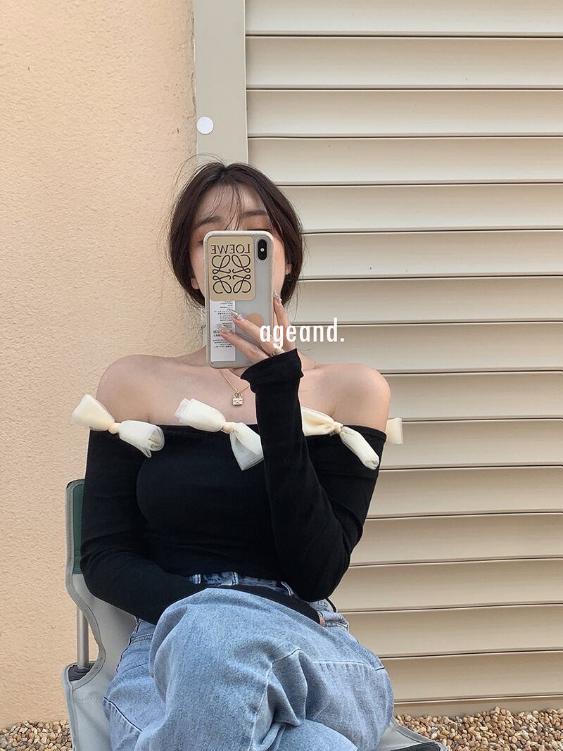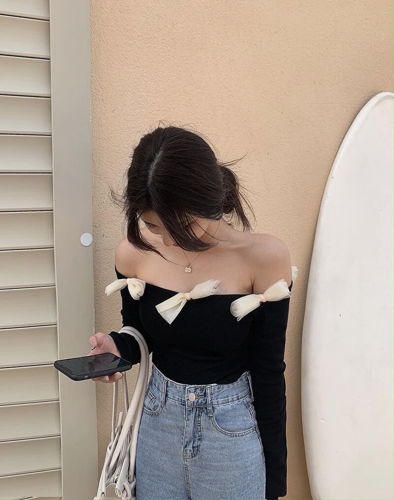 ライブ服女性アンカー服ポジェニック初秋の甘い弓セクシーなワンネックオフショルダートップTシャツ micat84588901575