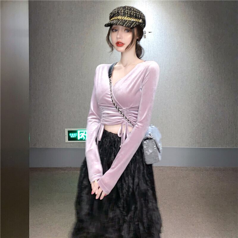 アンカーライブ放送服女性初秋新しいシックでセクシーなローカットディープVネックショートへそゴールドベルベットトップ micat55377365565