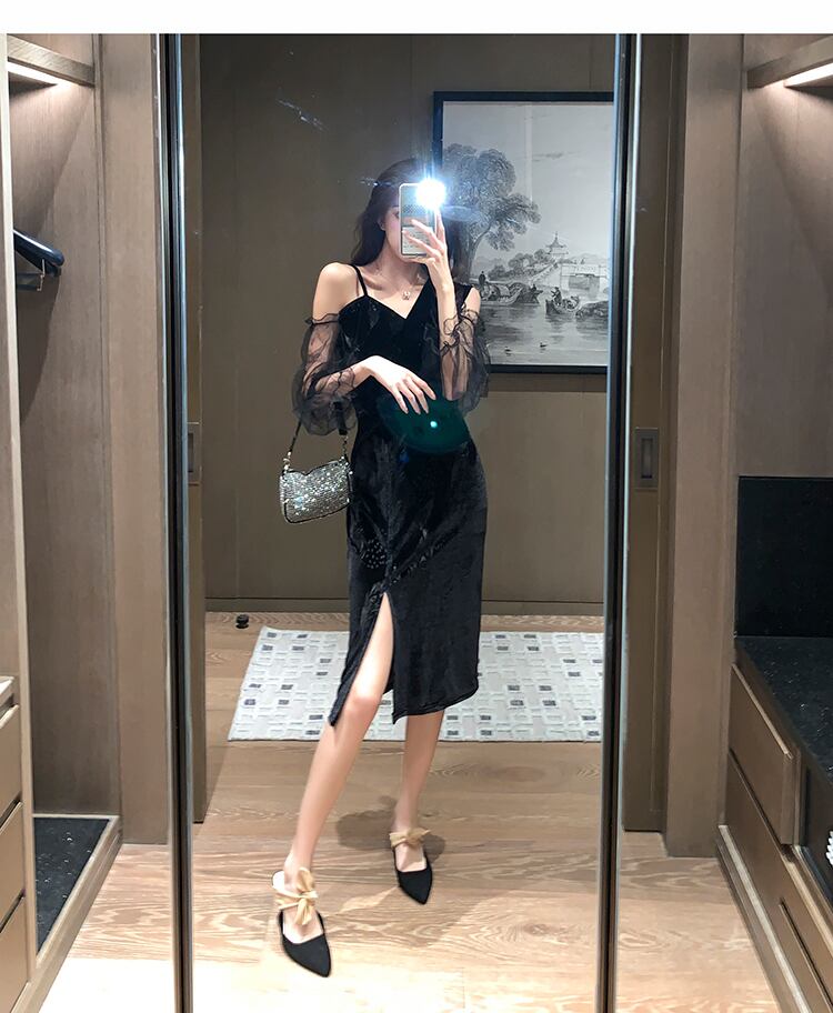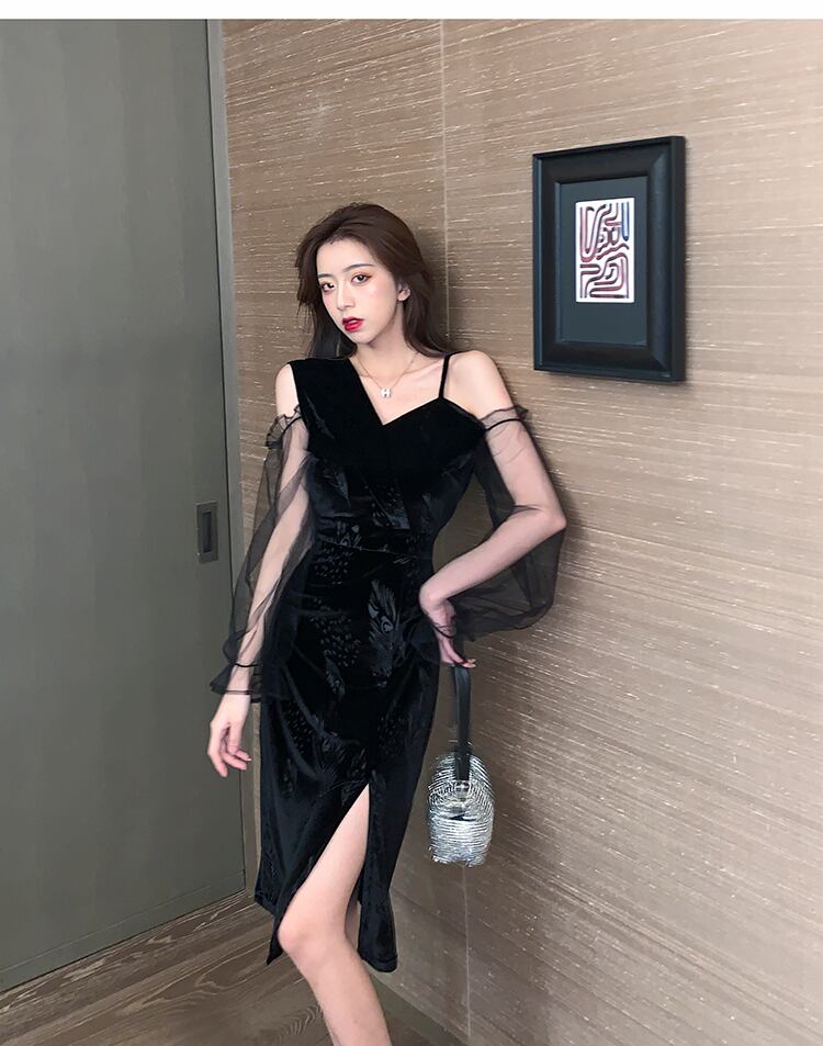 2021年の新しい女性のイブニングドレスの宴会の気質秋と冬のセクシーなメッシュゴールドベルベットミドル丈オフショルダードレス micat41399142532