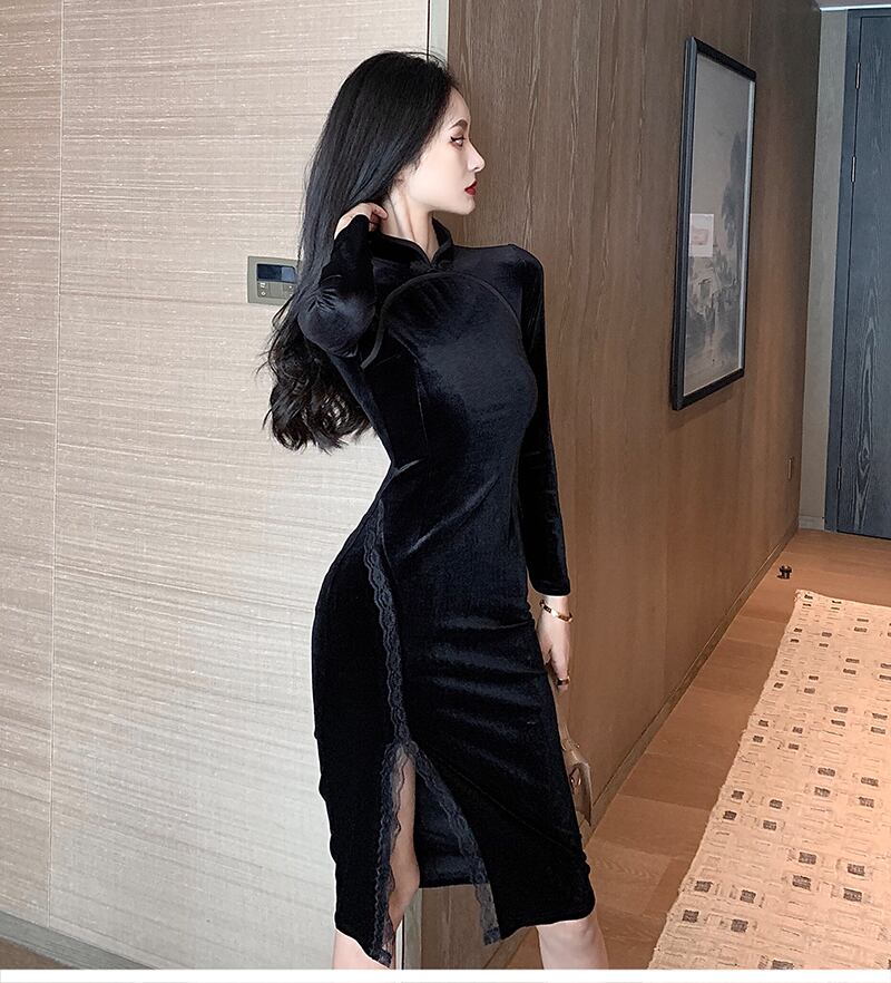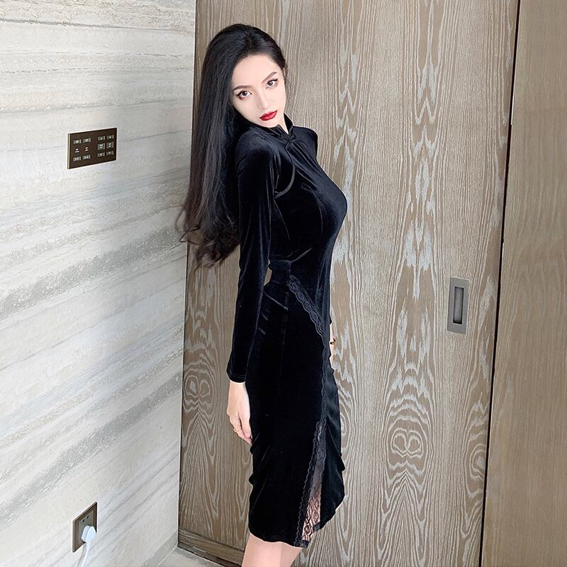 秋冬レトロチャイナスタイルヤングスタイル気質スリム長袖ゴールドベルベットチャイナドレス改良版ドレス micat88416019280