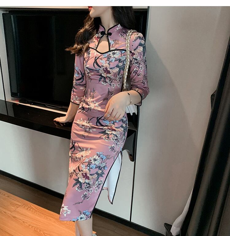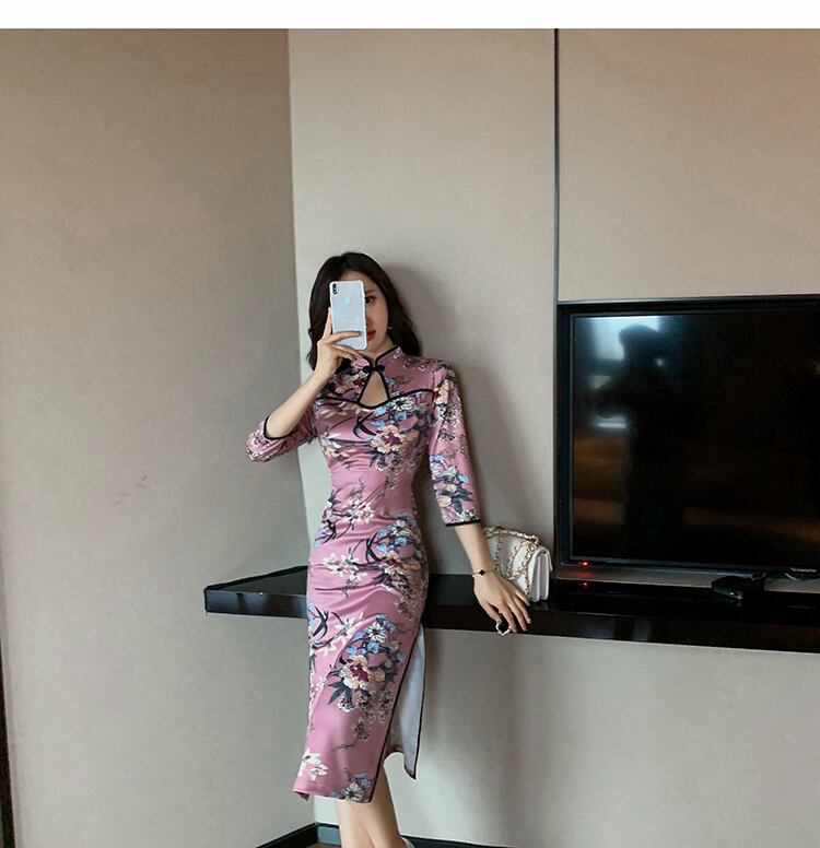 チャイナドレス秋の服2021新しいレトロな中国風の改良版七分袖スリムスリミングミドル丈ドレス micat77591106877
