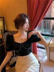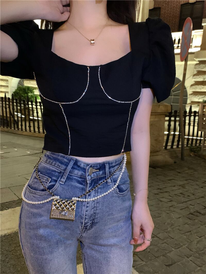 甘くてスパイシーなブラウス、女性の夏のデザイン、ニッチな服、セクシーな短いフレンチスクエアカラーのパフスリーブシャツ micat13247078600