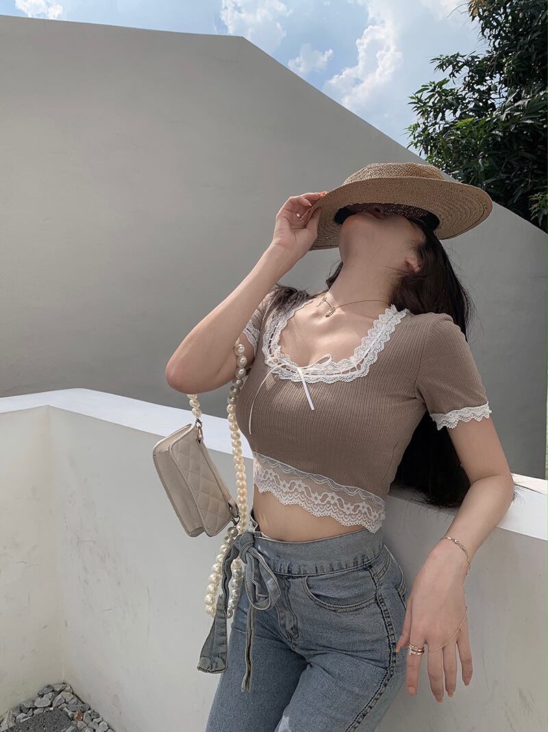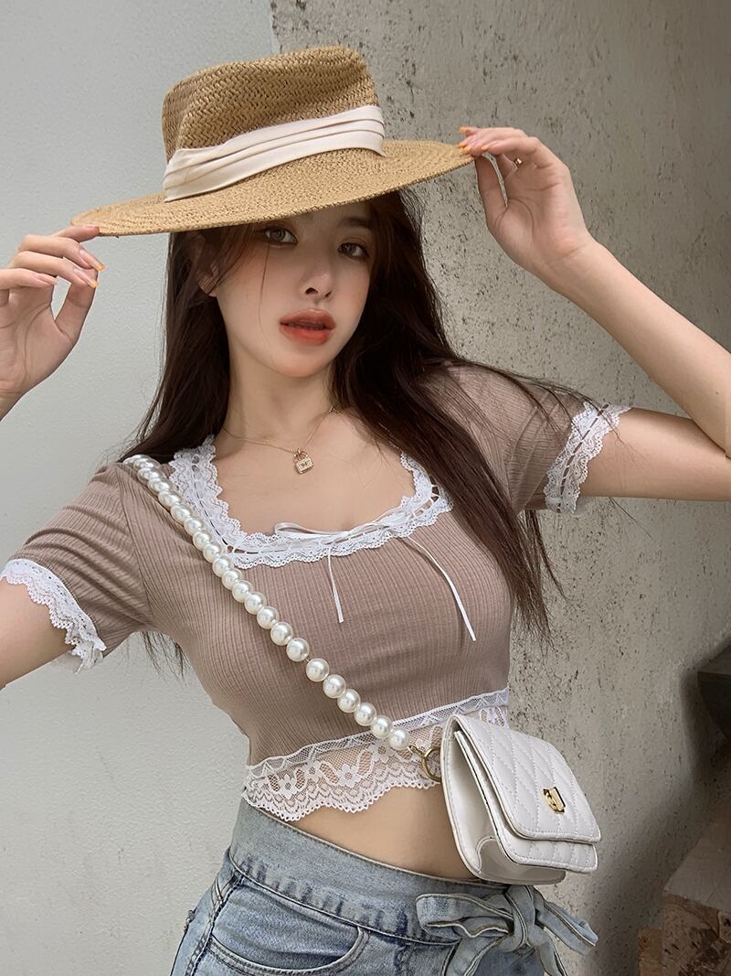 甘くてスパイシーなトップライブ服女性アンカーセクシーなレースフレンチスクエアカラーショートTシャツへそが露出 micat92637105593