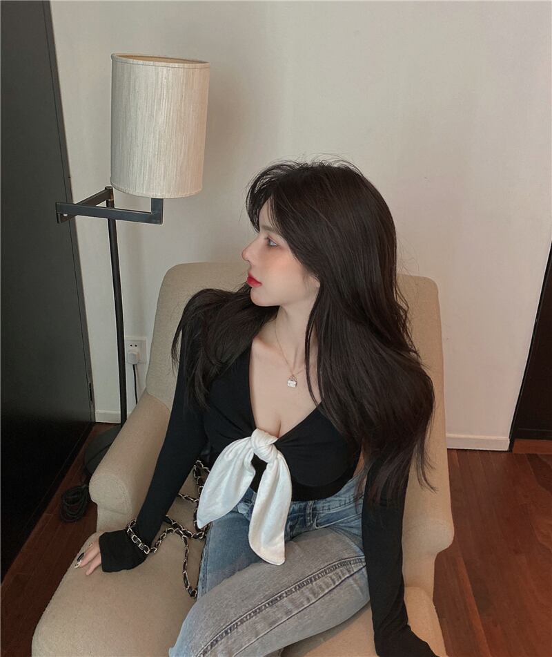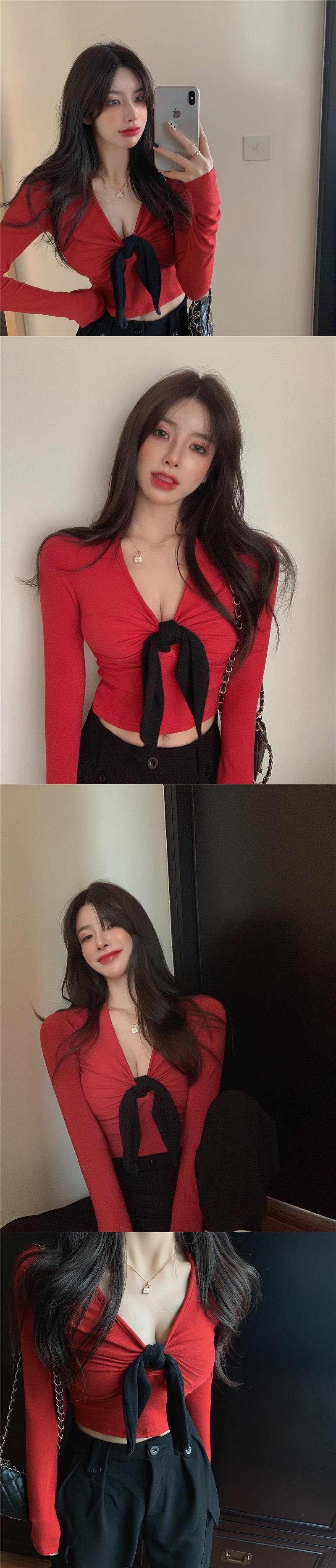 ミルキースウィートブラウス初秋新女生生放送アンカー服スウィートボウセクシーVネックショートTシャツおへそ付き micat77679960917