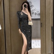 ナイトクラブはセクシーなイブニングドレスを着用しますロングスカートは女性の輝く傾斜した襟を叩いていますワンショルダーオフショルダーロングドレス micat37817108616