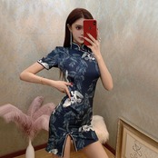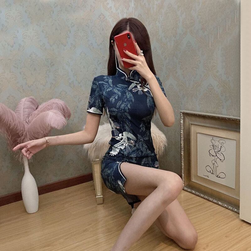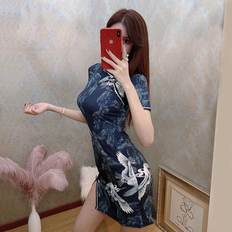 共和党スタイルのドレス気質レトロな中国スタイルのクレーン印刷セクシーなスリムショートチャイナドレス改良版ドレス micat20220884437