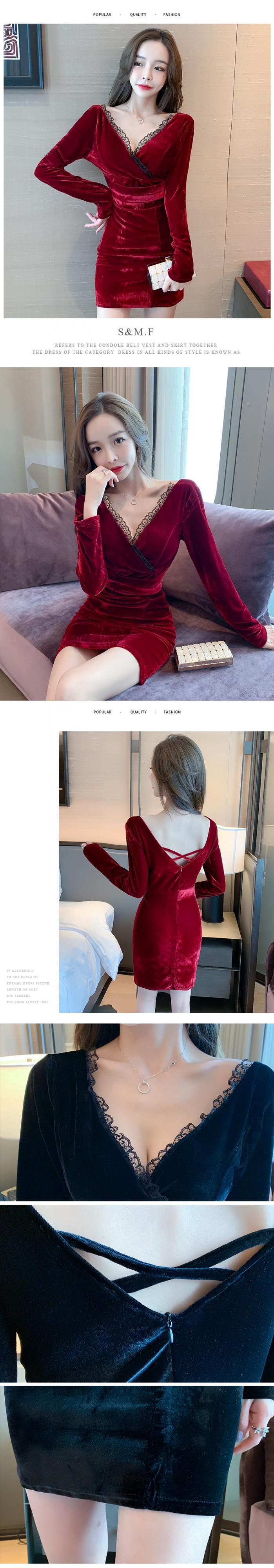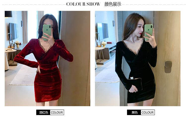 ナイトクラブの女性の秋と冬の夜の作業服セクシーなローカットディープVネック長袖スリムゴールドベルベットドレス micat79009594302