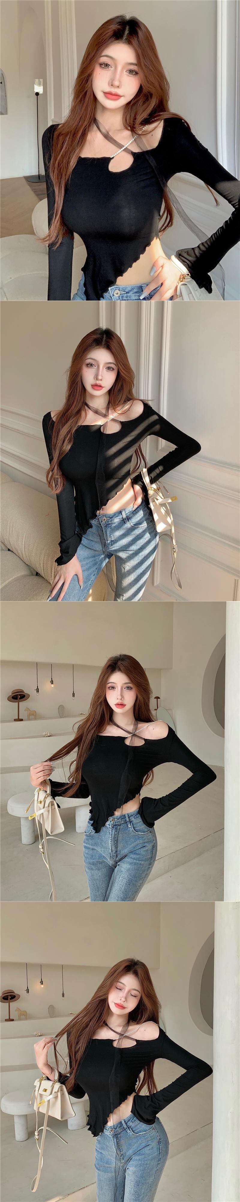 初秋のブラウス女性の長袖香港は純粋な欲望の服を味わうセクシーな不規則なストラップレスショートスリングTシャツ micat1623690104