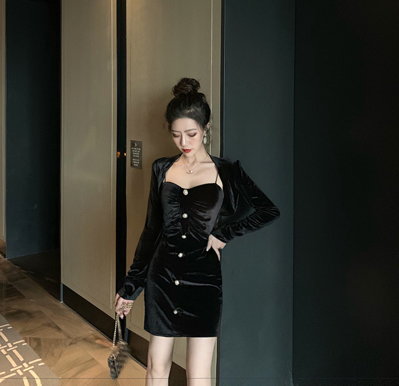 ソルトフライストリートスーツ女性秋ゴールドベルベットショールトップ+セクシーバッグヒップスリングドレスツーピーススーツ micat41076053034