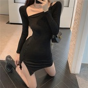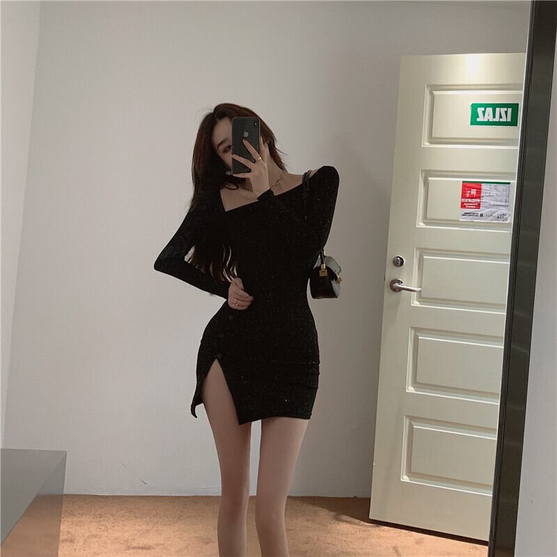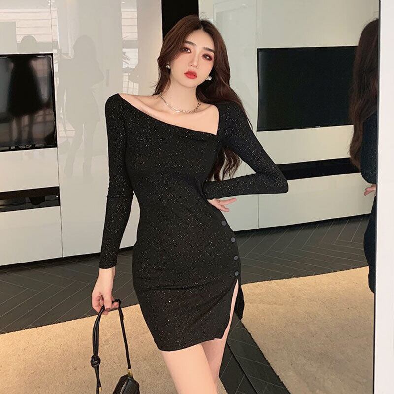 ナイトクラブレディースナイトクラブバージャンピングディリトルブラックドレスシャイニングセクシースラントカラー長袖タイトフィットヒップドレス micat98626160670