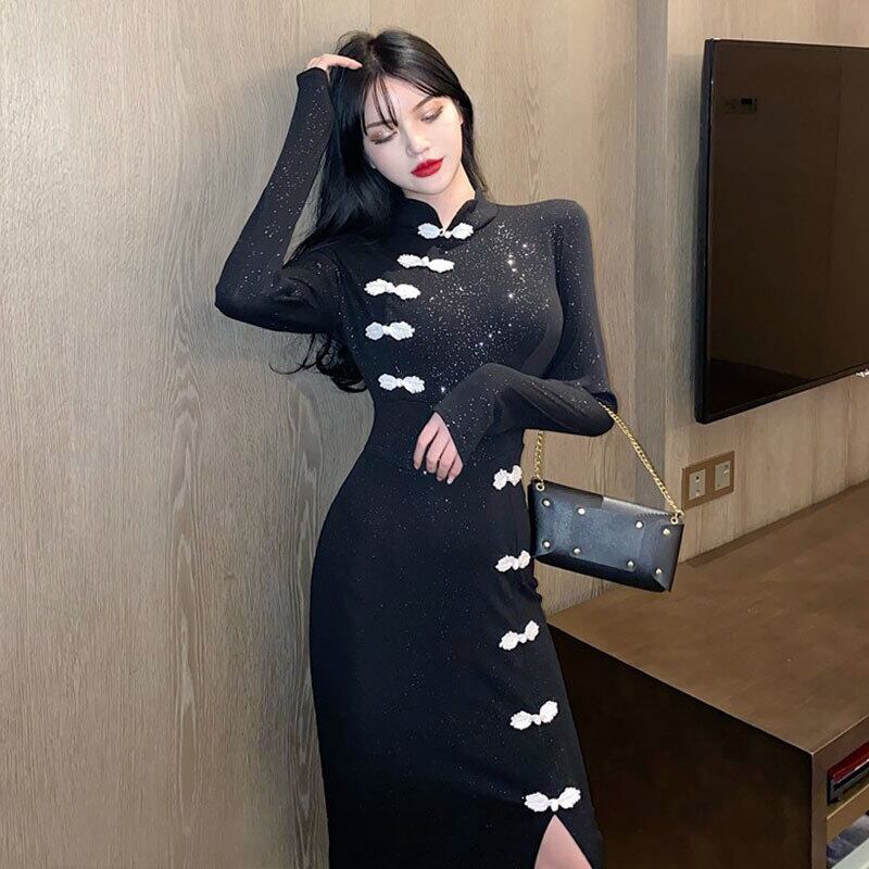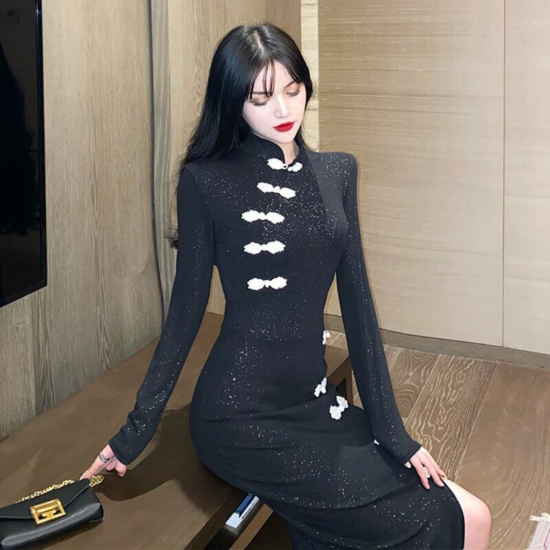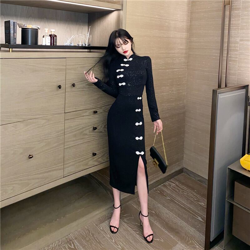 改良されたチャイナドレス2021新しい女性の若い中国風の光沢のある長袖の黒のミドル丈ドレス micat88349985393