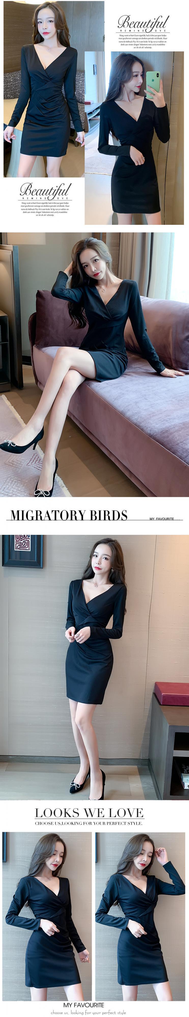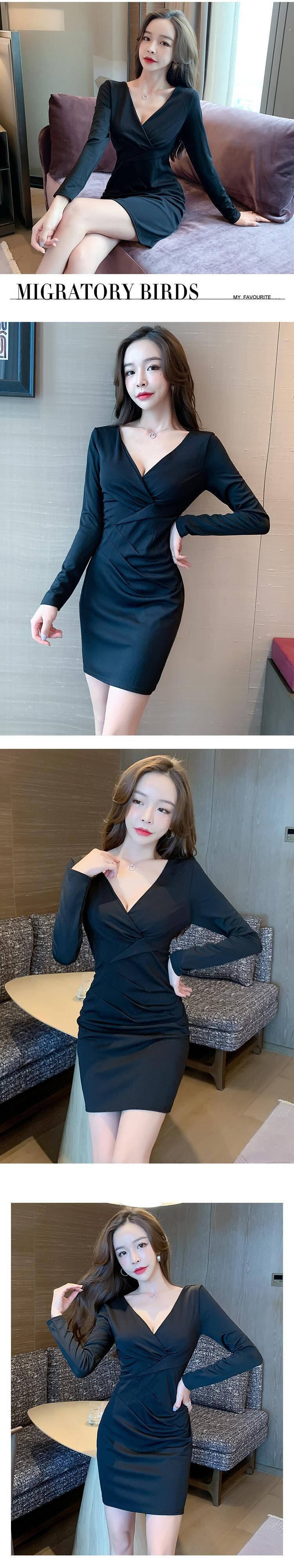 ナイトクラブ婦人服店ナイトワーク服セクシーなローカットディープVネック長袖スリムスリミングお尻ワンピース micat30389663781