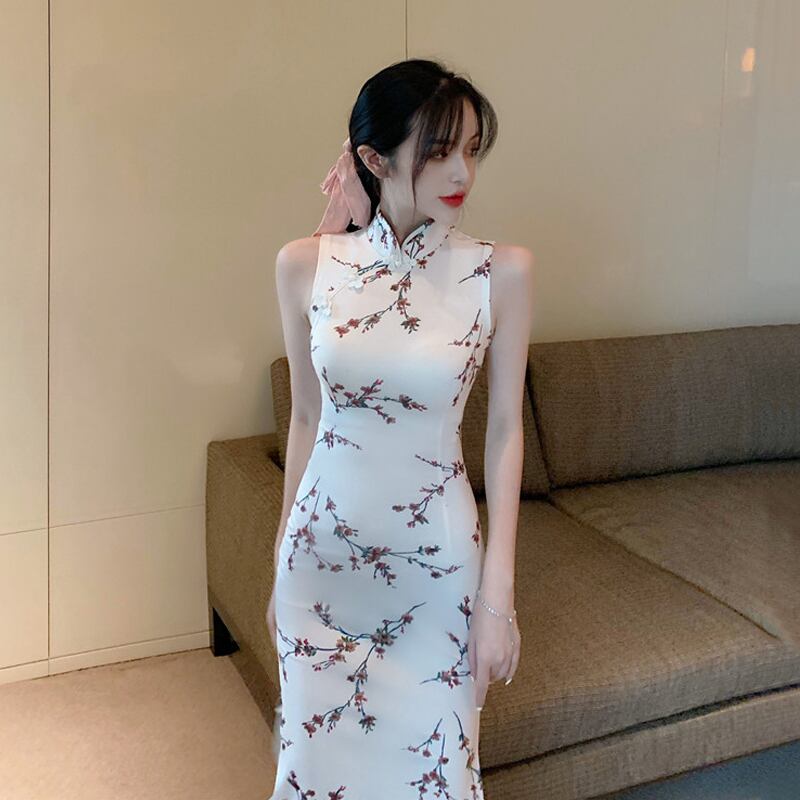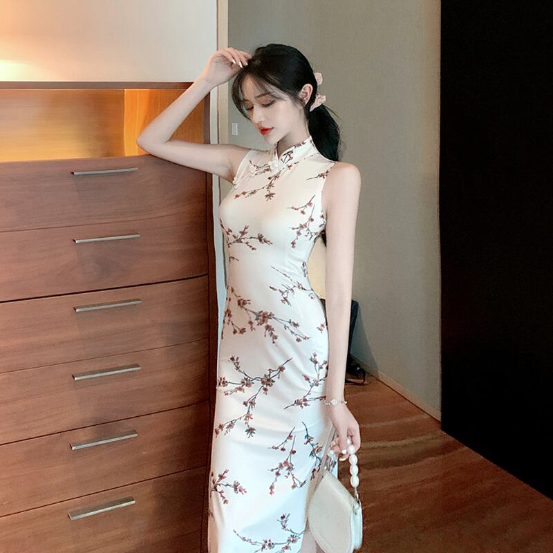 イブニングドレス女性2021新しいレトロな中国風のセクシーなスプリットノースリーブミッドレングスチャイナドレス改良版ドレス micat31277909584