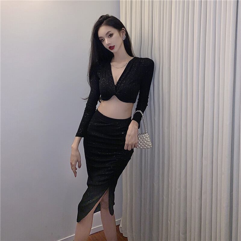 ナイトバージャンプスーツブラックシャイニーセクシーローカットディープVネックショートベリーボタントップスカート付き micat86072489476