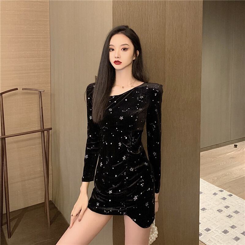 秋の婦人服2021年新しいナイトバージャンプディリトルブラックドレスきらびやかなブロンズベルベットバッグヒップドレス micat1850807147