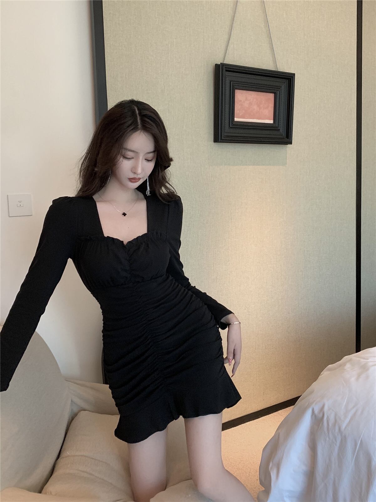 2021年秋新しい女性有名人の気質セクシーなスクエアカラーはスリムな痩身フィッシュテールバッグヒップドレスを折ります micat926237602