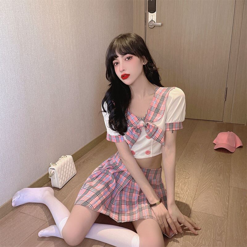 ナイトクラブ作業服スーツ女性JKボウセクシーショートシャツ+ハイウエストチェック柄プリーツスカートツーピーススーツ micat22270995303