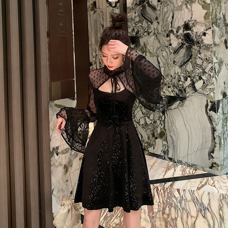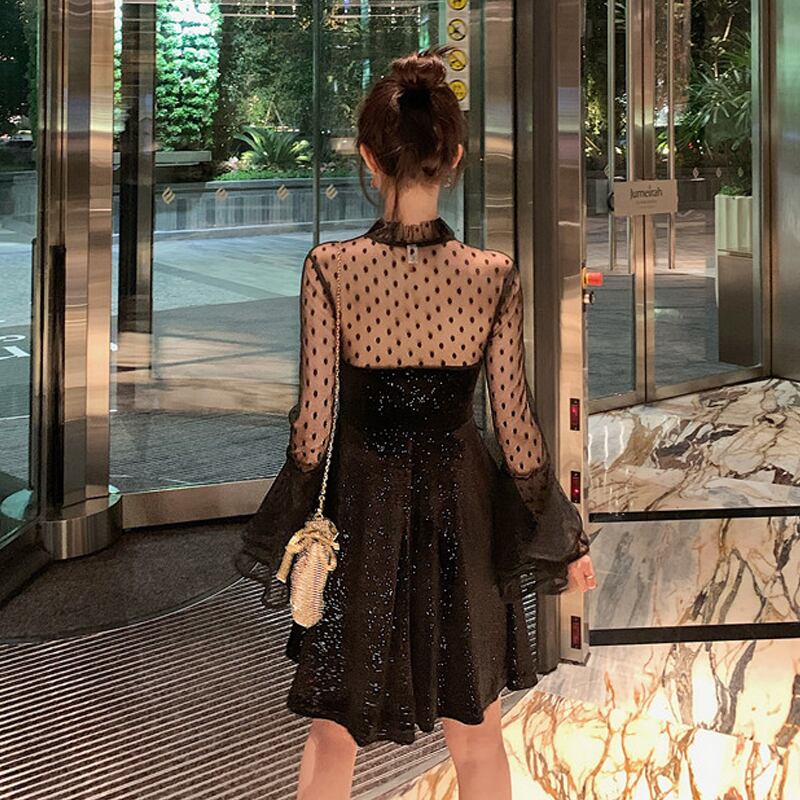ナイトクラブショップは有名人のリトルドレス、きらめく短い小さな黒いドレス、セクシーな胸のくぼみとウエストのふくらんでいるドレスを着ます micat94476562788