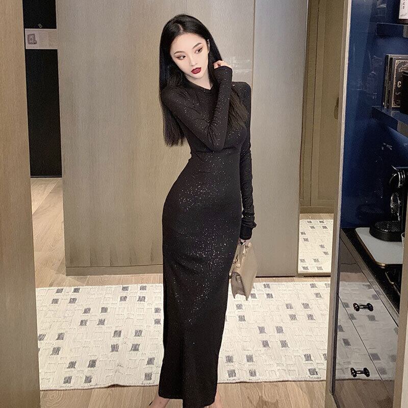 2021年秋新しい女性のきらびやかな明るいブロンズ気質セクシーな黒のミドル丈インナーベースドレス micat19892205912