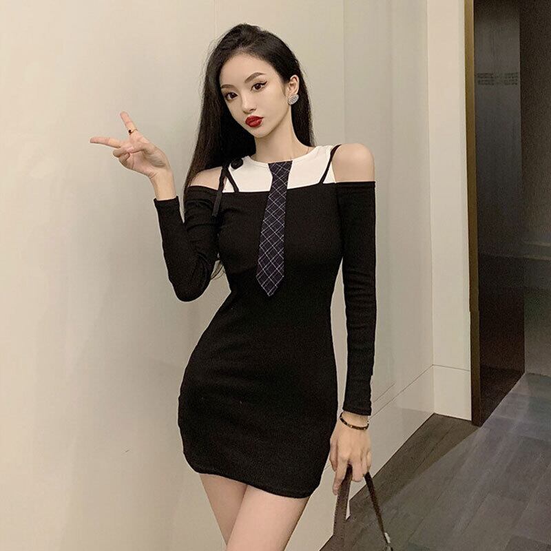 ネットレッドアンカーコスチューム女性秋ポジェニックセクシーストラップレスネクタイ長袖フェイクツーピースヒップドレス micat36659085138